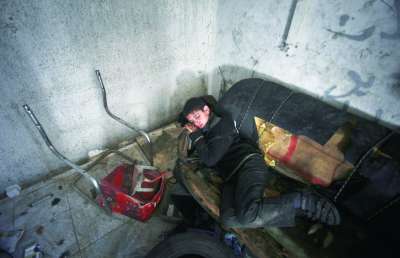 ①11岁的巴勒斯坦童工阿尼斯在修车间歇睡觉。