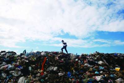 ③11岁的巴勒斯坦儿童艾哈迈德·曼索尔站在贾巴利亚难民营的废物堆里,回收塑料和金属。