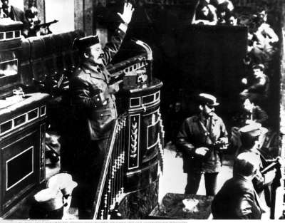现场只有两个人纹丝不动,一个是前首相苏亚雷兹,另一个是共产党总书记卡利约。议员中的梅利亚多将军要求政变者退后,却被打翻在地。苏亚雷兹跳起来冲上前去,试图保护将军,同样被当场“放倒”。在场的一位摄像师几乎全程记录了最初半小时的情况。