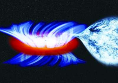 美国国家航空航天局(NASA)钱德拉X射线天文台最近观测到了这一幕——这个具有恒星质量的黑洞被称为IGR J17091,其强大的吸引力拖住了右侧来自于伴星的气体,在黑洞周围形成磁盘形状的热气,风驱赶着“磁盘”旋转。