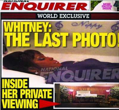 惠特妮·休斯顿2月11日在洛杉矶比佛利山希尔顿饭店猝逝,享年48岁,2月19日安葬故乡纽泽西“丽景”墓园,但她死后仍不得安宁,最近一期的美国《国家询问报》封面刊出她躺在棺木里的遗容照。消息一出就引起轩然大波,粉丝炮轰该刊罔顾道德,做法不妥。