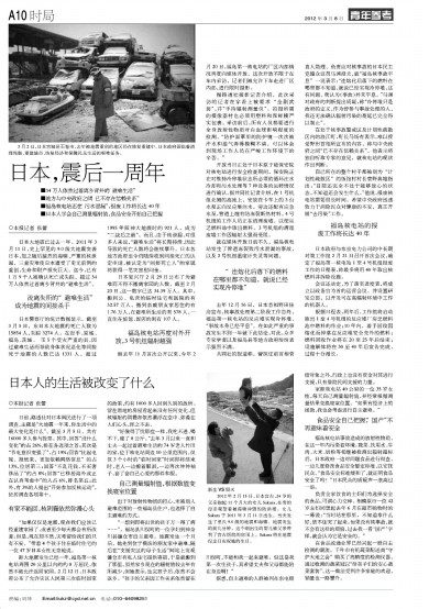 日本大地震已过去一年。2011年3月11日,史上罕见的9.0级大地震突袭日本,加之随后猛烈的海啸、严重的核泄漏,三重灾难使日本遭受了史无前例的重创,生命和财产损失巨大。迄今,已有1万9千人被确认死亡或失踪,超过34万人依然过着离乡背井的“避难生活”。