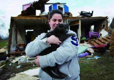 马里斯维尔的一名居民抱着自家幸存的猫。