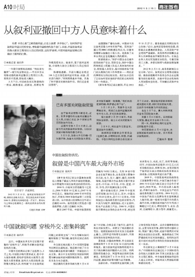 3月7日,中国商务部长陈德铭的一席话,被路透社、法新社、美联社等外媒高度关注。他表示,鉴于叙利亚局势,中国绝大部分工程项目人员已经回国。