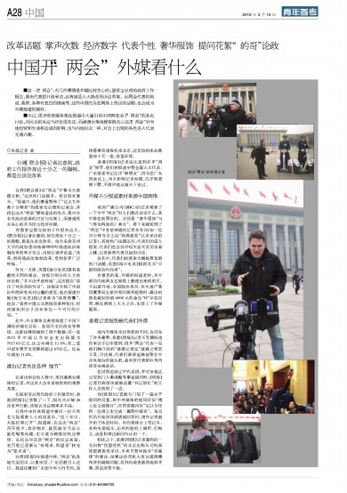 ■这一次“两会”,有几件事情是外媒比较关心的:温家宝总理的政府工作报告,重庆代表团开放采访,还有就是人大修改刑诉法草案。而两会代表的构成、装束、各种有意思的提案等,这些中国民众在网络上热议的话题,也会成为外媒报道的题材。