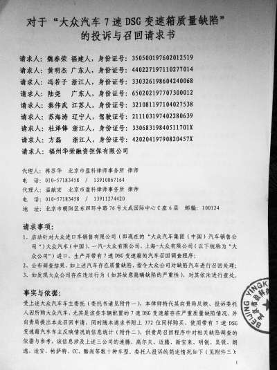 3月12日,北京市盈科律师事务所律师蒋苏华正式向国家质检总局递交“大众汽车7速DSG变速箱质量缺陷”的投诉与召回请求书。据悉,请求书中不仅有9位委托人授权书,还包含372位车主关于大众汽车7速DSG变速箱故障的情况统计。国家质检总局相关部门已接受召回请求书,将于15个工作日后给予答复。
