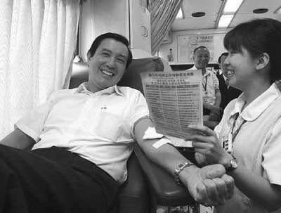 马英九说,他的血型是O型,是捐血中心需求最高的血型。每次捐完血,他都有一种很奇特的温馨感。看着街上人来人往,熙熙攘攘,他常想,其中说不定有人曾经输过他的血,甚至因为及时输血而保住一命。这种感觉很温馨,让他觉得和这块土地以及土地上的人民,有一种很真实的、血脉相连的关系。也因为这种温馨的同胞感,让他捐了24年的血。马英九说,他记得20年前,每次捐完血回家,都会把捐血中心送的鲜奶与饼干留给女儿吃,还说这是爸爸用鲜血换来的呢!