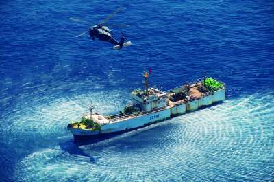 到达渔船所在海域后,4位救援人员从“战斗阴影”伞降到海面,然后登上一艘载有医用补给的充气橡皮艇,驾着它驶近渔船,上船为受伤的渔民治疗。