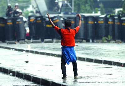 3月27日,印尼雅加达,一名抗议者与警察对峙。当天,印尼民众在总统府附近举行示威,抗议政府的油价上涨计划。印尼政府决定从4月1日起将油价上调三分之一,以减少政府在油价补贴上的开支。