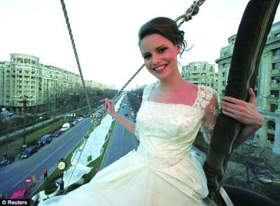 长长的婚纱裙摆从来都是婚礼上一道亮丽的风景线,但在罗马尼亚首都布加勒斯特,有件婚纱的裙摆长度已远远超出伴娘双手的控制范围,必须借助热气球来加以展示。