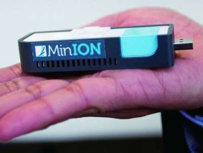 在今年2月召开的基因组生物学技术进展年会(AGBT)上,来自英国的一家科技公司宣布推出一款便携的基因组测序仪。它仅为U盘大小,只需插入电脑便可使用。该设备由传感器芯片、专用集成电路和一个完整的单分子感应测试所需的流控系统构成,通过使用纳米孔检测系统找出分子并进行分析,在6个小时内便可快速测序1.5亿对碱基对。尽管该设备的检测效率极高,它的预计售价却不超过1000美元,因此小型医疗机构和普通家庭都可以负担得起。