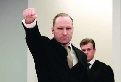 4月16日,挪威袭击案凶手布雷维克在奥斯陆法院接受审讯,在法庭上挥拳致意,得意微笑,拒绝认罪。去年7月,布雷维克在奥斯陆政府大楼附近引爆炸弹,造成8人死亡,随后在工党青年团夏令营开枪杀害69人。
