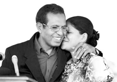 4月18日,前东帝汶国防军司令鲁阿克当着数百名支持者的面,将妻子揽在怀里。两人都笑得很甜。当日,他宣布自己获得总统选举胜利。