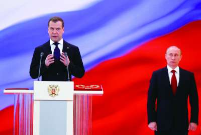 梅德韦杰夫在普京的宣誓就职仪式中发表讲话。 |