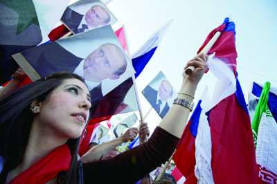 叙利亚大马士革的民众当天聚集在俄罗斯驻叙使馆外,庆祝普京就任新一届俄罗斯总统。 |