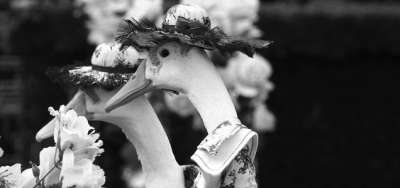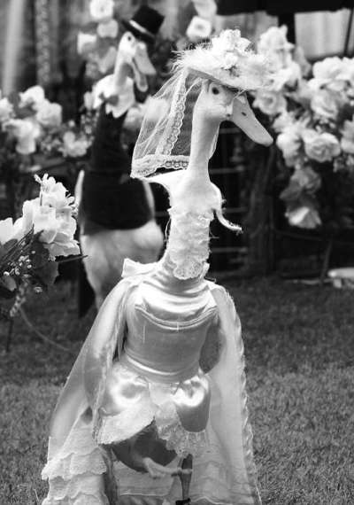 除了正常的时装秀外,今年鸭子们还带来了一场婚庆主题的表演秀,身披婚纱和穿着燕尾服的“新娘”和“新郎”一前一后走过草坪,引来了围观者的一片惊呼。