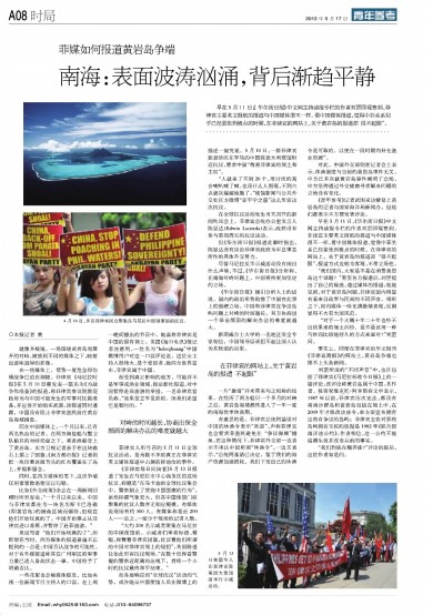 早在5月11日,《华尔街日报》中文网主持读报专栏的作者刘罡即观察到,菲律宾主要英文报纸的报道与中国媒体很不一样。看中国媒体报道,觉得中菲关系似乎已经紧张到极点的时候,在菲律宾的网站上,关于黄岩岛的报道却“很不起眼”。