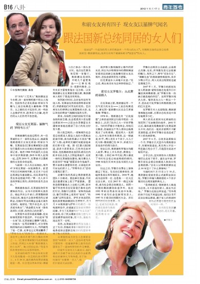 57岁的“三无男人”奥朗德虽至今未婚,却一直有精明强干的女人相伴,包括知名记者瓦莱丽·特里尔韦勒与上届总统候选人塞格琳·罗雅尔。从之前的名不见经传,到一鸣惊人击败萨科齐、跻身权力之巅,他背后的女人们作用不容忽视。