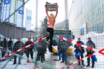 下午两点,面对大约40名媒体记者,她们跑向广场,同时脱掉衣服,举起标语。法国的抗议者赤裸上身,乌克兰的抗议者只穿黑色内裤,大家一起尖叫……