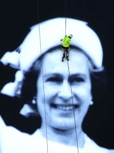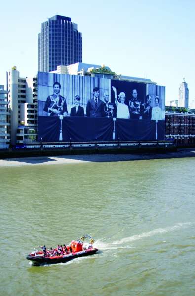 泰晤士河畔竖立起巨幅皇室成员照片,内容为皇室成员在1977年女王登基银禧庆典时,在白金汉宫阳台向民众致意的景象。照片长100米、宽70米。 |
