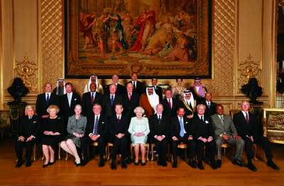 英女王(第一排中)在温莎城堡与世界各君主立宪制国家元首合影,庆祝自己登基60周年。 |