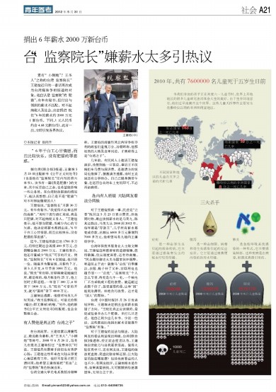 素有“小钢炮”、“王圣人”之称的台湾“监察院长”王建煊近日的一番话再次成为台湾媒体争相报道的对象。他自认是“监察院”的“肥猫”,有车有秘书,但付出与领到的薪水不匹配,对不起纳税人及社会,决定捐出“院长”6年的薪水约2000万元(新台币,下同,1元人民币约合4.68元新台币)。此言一出,立即引发各界热议。