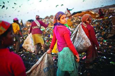 2010年2月18日,印度新德里的拾荒者们在Ghazipur垃圾填埋点捡拾可回收的垃圾。 |