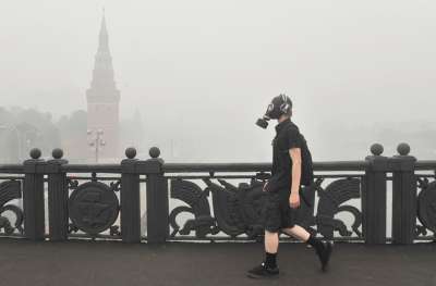 2010年8月8日,俄罗斯,一名男子戴着防毒面具走在莫斯科街头。因山火产生的浓烟笼罩着莫斯科,当地气温上升至38摄氏度。 |