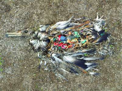美国著名“垃圾摄影家”克里斯·乔丹和同伴在北太平洋的中途岛,拍摄了因吞食塑料垃圾而死去的信天翁幼鸟尸体。皮肉已经风化,只剩下骨架、羽毛和喙,身体里堆满的打火机、瓶盖、塑料球、尼龙线和玩具零件仿佛取代了内脏…… |