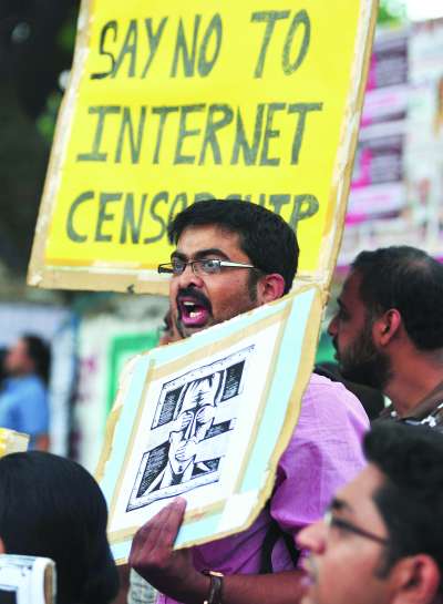 6月9日,印度南部城市班加罗尔,网络活动分子和黑客组织成员上街游行,示威抗议政府颁布强制的法令封杀文件分享和视频网站,以及进行网络内容审查。