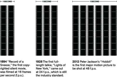 传统放映机每秒钟会播放24帧图像,并利用人眼的视觉暂留现象,使人眼获得连续运动图像。大导演詹姆斯·卡梅伦、彼得·杰克逊提出,将每秒播放帧数增至48甚至60,这将改变我们看电影的体验:人们将觉得色彩更艳丽、图像更锐利、动作更平滑。
