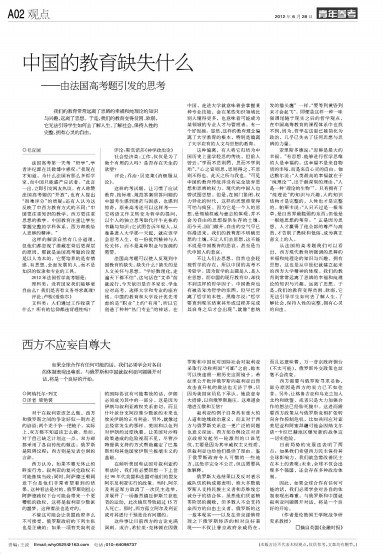 从法国的高考题我们可以看出,西方现代教育所强调的思辨的幸福和纯理论的知识与兴趣。拥有思想,这也是从中世纪就建立起来的西方大学精神的体现。我们的教育则常常远离了思辨的幸福和纯理论的知识与兴趣,远离了思想。于是,我们的教育变得贫困、软弱,它无法引导学生如何去了解人生、了解社会,保持人性的完整,拥有心灵的自由。