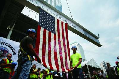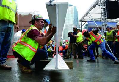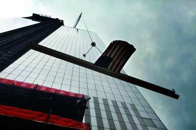挂有国旗的钢梁被吊起至高空。它将被安装在楼顶上。 |