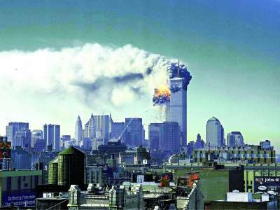 纽约世贸中心遭恐怖袭击后,为避免被大火烧死,求生的人们从400米高空纵身跃入死神的怀抱(摄于2001年9月11日)。 |