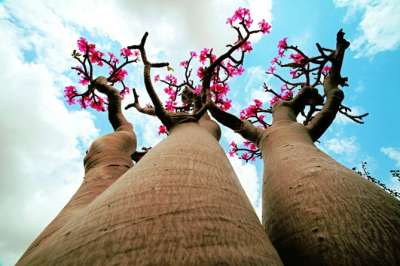 次日下午空气灼热,当我和植物学家莉萨·班费尔德登上怪石嶙峋的山坡,前方出现了高大的树影。19世纪,外人初见这种植物时,吃惊地称其为世界上最丑的树,后来却给它起了个“沙漠玫瑰”的雅号,兴许是因为那紫色的花朵而回心转意了吧。从生物学角度讲,“沙漠玫瑰”是适应极度干旱条件的典型,树干能储存水分,并深深地扎根于岩缝中。