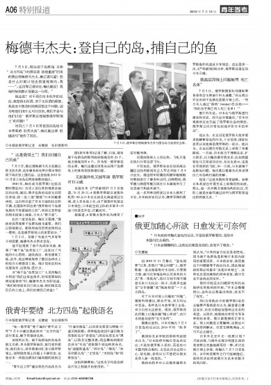 7月5日,刚从南千岛群岛(日称“北方四岛”)的国后岛“故地重游”回来的俄总理梅德韦杰夫,被记者问道,“您是什么时候计划去那里视察的,我……”。还没等记者问完,梅氏就说:“我每时每刻都计划着这一行程。”