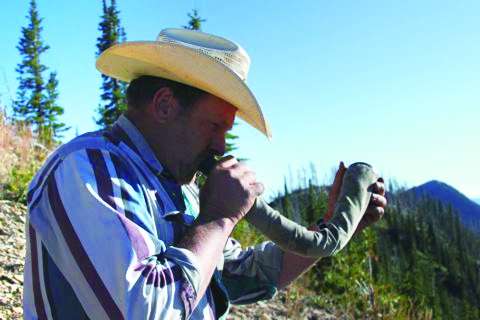 第五天的太阳从群山后升起时,对野生动物的好奇已被壮丽的风景和诱人的野餐冲走了。但我仍准备做最后的尝试。很快,杰克也在山脊侧面发现了母麋鹿的身影,还有个小家伙跟在后头;半小时后,随着杰克吹响喇叭,一头健壮的雄鹿大摇大摆地登上了舞台。“既然如此,树林里的麋鹿或许更多”,他边解释边把手枪递过来,让我揣好。