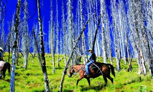 集合点离农场20英里,位于“鲍勃”边缘一条小道的入口处。捆扎好行李、检查完马具,我们列队向这趟旅程的前进基地——里奇营地出发。杰克在尘土漫天的小道上开路,一如他父亲半个世纪前所做的那样。马蹄在山坡上划出“之”字形的路线,周遭绿野苍茫。一个小时没到,大伙儿都已气喘吁吁,牛仔裤很快被浸湿了,关节被颠得隐隐作痛。