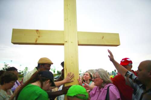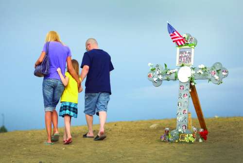 7月30日,奥罗拉市,一个十字架上贴满了影院枪击案遇难者的照片,人们来此对逝者表达哀思。 |
