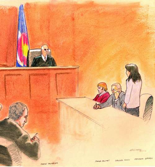 (法庭素描)7月30日,24岁的丹佛枪击案嫌疑人霍姆斯再次出庭受审,受到142项犯罪指控,其中包括12项一级谋杀指控。检察官称,需要数周时间决定是否会对霍姆斯动用死刑。 |
