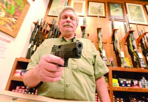 7月27日,美国亚特兰大一家出售枪支的商店里,店员面带笑容地展示一把手枪。 |