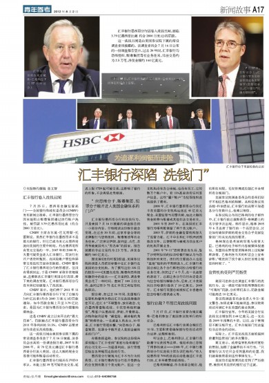 据美国《纽约时报》报道,美国参议院的调查人员把目标集中在汇丰银行在美国的分支机构。为了撰写这份335页的报告——《美国在洗钱、贩毒和恐怖组织融资中的弱点——汇丰案例》,调查委员会花了一年时间,查阅了140万份文件,盘问过至少75名汇丰员工和监管机构职员。