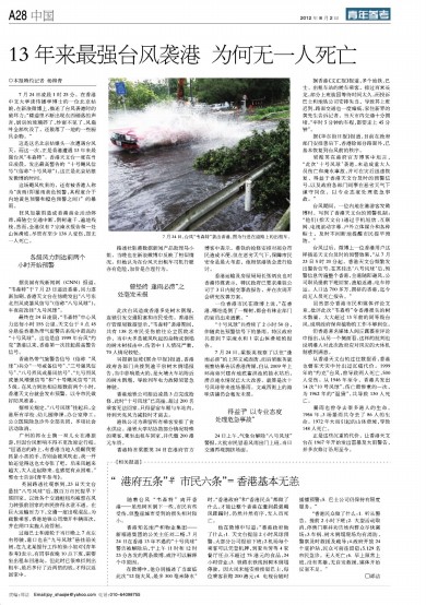 7月24日凌晨1时25分,在香港中文大学读传播学博士的一位北京姑娘,在新浪微博上,描述了台风袭港时的破坏力:“楼道里不断出现东西砸落的声音,厨房的玻璃碎了,纱窗不见了,风扇叶全部吹没了,还散落了一地的一些厨具杂物。”