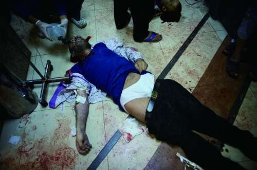 8月10日,在阿勒颇,护士正在救助一名受伤的男性。叙利亚政府军与反对派武装“叙利亚自由军”在当地展开的激战造成大量房屋被毁,死伤惨重。 |