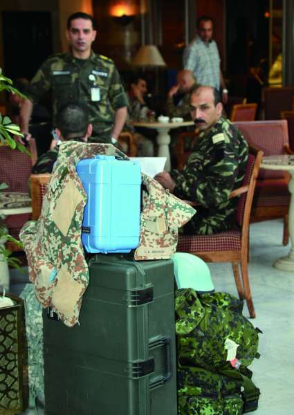 属于联合国叙利亚监督团的行李被堆在大马士革一家酒店里,等待被运走。8月13日,监督团负责人盖伊召开新闻发布会,宣布鉴于叙利亚暴力局势的发展,监督团决定再次削减观察员人数,约42名观察员当天撤离叙利亚。 |