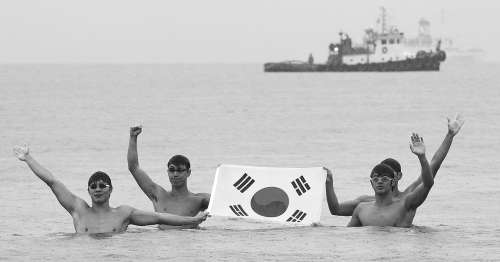 13日,韩国歌手金章勋带领约40名韩国国家体育大学游泳俱乐部的学生,组成一支游泳队,从东部的于蔚真郡下海,开始了一趟行程220公里、历时48.5小时的游泳接力。15日,两名队员顶着风浪,成功登上独岛。