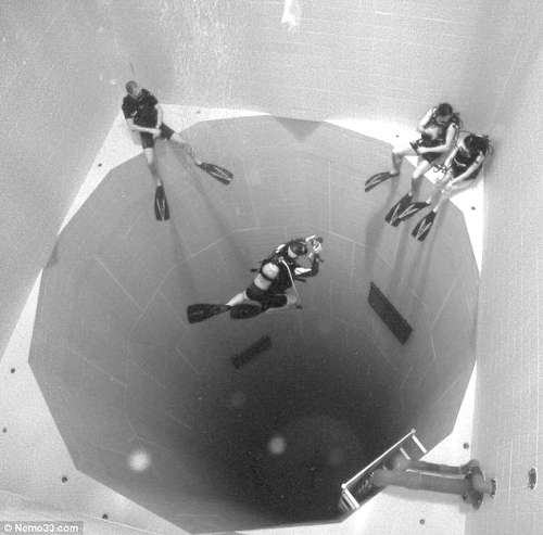 不过,游泳池最吸引人的地方还在于它那深达33米的巨大圆形潜水井。这个潜水井是专为潜水爱好者设计的,因此具有相当大的挑战性,潜水员需要背上氧气瓶,穿上蛙鞋,才能潜到水底,并在那里逗留片刻。在潜水井的井壁上,还专门开出了14个水下窗口,可以让那些慕名而来的游客在此观看潜水员的整个潜水过程。