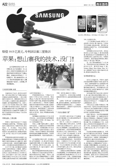 当地时间8月24日,备受关注的苹果、三星专利官司终于有了结果:加州圣何塞地方法院陪审团判定,三星公司的确存在侵权行为,需赔偿给苹果公司10.5亿美元。三星股价大跌,美国商家开始抛售三星可能被禁售的产品。分析人士认为,作为“安卓机”排头兵的三星败诉,对整个安卓阵营打击较大。未来安卓机制造商模仿苹果产品之路被堵死,他们被迫改进设计以规避苹果。短期内,苹果产品如即将发布的iPhone 5的市场优势会更明显。