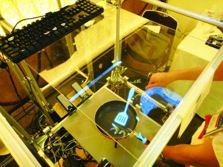 炒菜做饭不仅是一项技术活,更是一门艺术,然而要想尽快成为烹饪大师,勤加训练是必不可少的,但又如何在不浪费食物的情况下成为烹饪高手呢?来自东京工业大学的研究人员,开发了一套虚拟烹饪装置,该装置包括平底煎锅、铲勺、投影屏幕以及模拟仪和数根制动丝线。