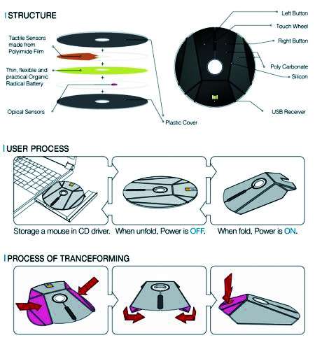 便携性鼠标的设计层出不穷,这款概念平板鼠标却另辟蹊径,融合了折纸玩具的概念,采用折叠结构竟将立体鼠标转换成了一片CD光盘!